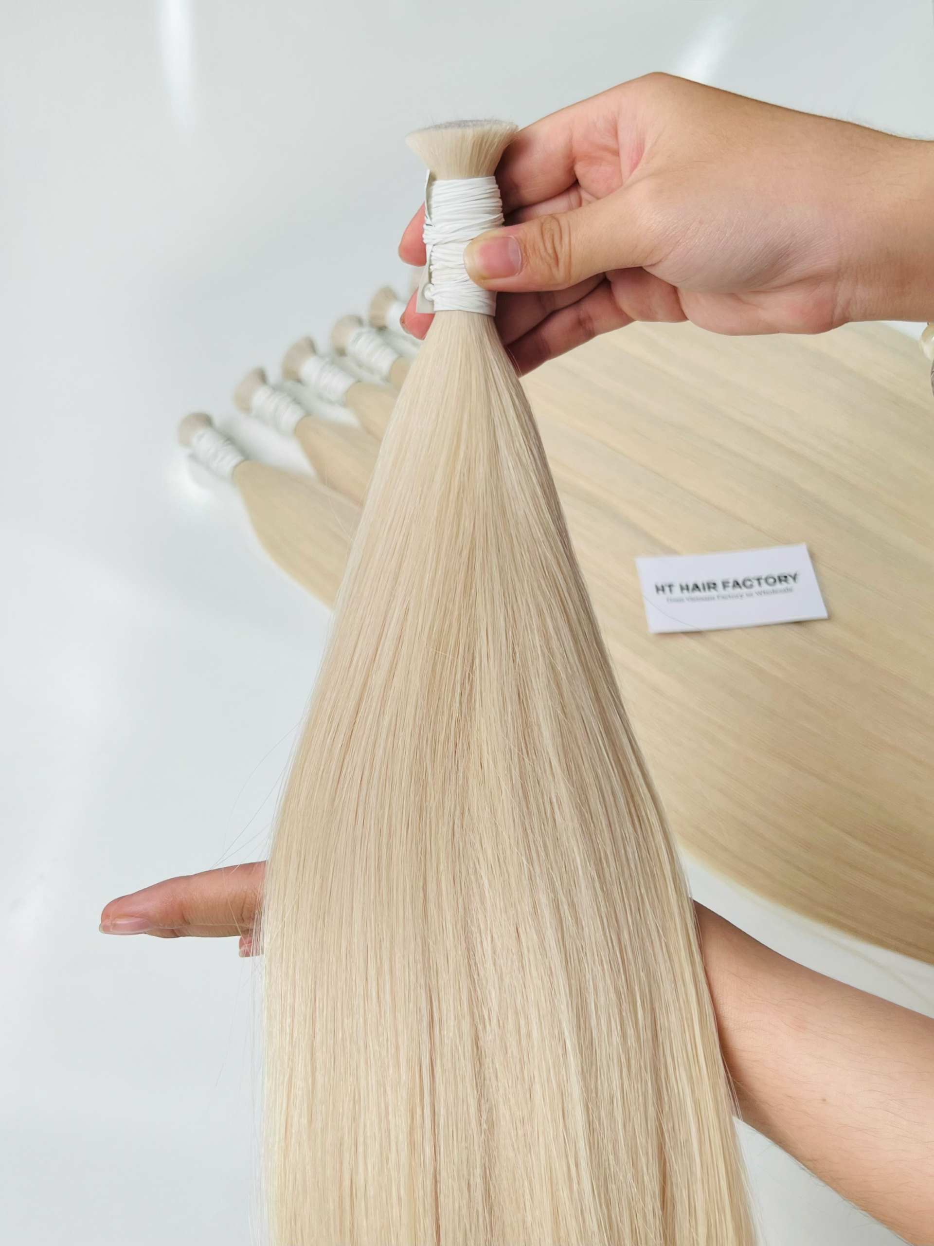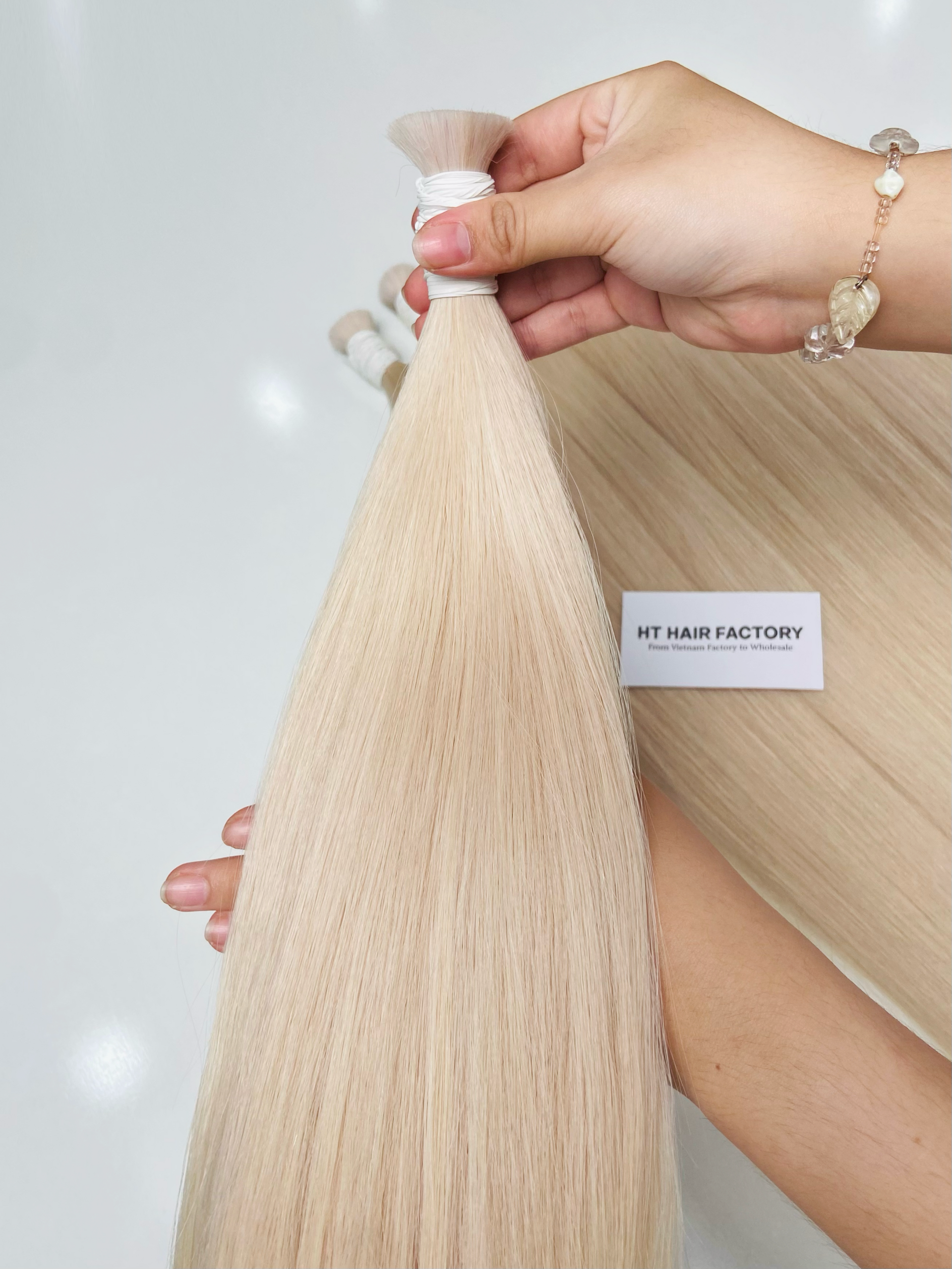 Bulk hair colored extensions are loose hair bundles that can be used for multiple applications such as weaving, braiding, keratin tips, clip-ins or custom wigs. The main difference lies in their wide color variety – from natural black and dark brown to platinum blonde, ombre, balayage, and custom fantasy shades. HT Hair Factory uses advanced dyeing techniques that ensure consistent tones, prevent fading and maintain the silkiness of Vietnamese hair. Whether you are a stylist looking for trendy shades or a wholesaler building your own hair brand, colored bulk hair provides flexibility and value.